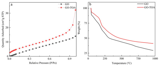 The nitrogen adsorption isotherms of GO and GO-TOA (a); TGA curves of GO and GO-TOA (b).