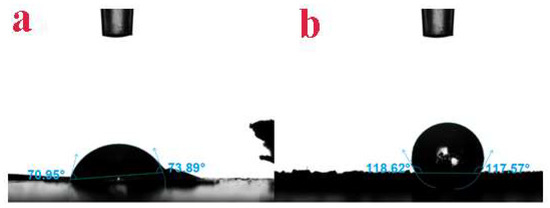 In order to further prove the successful introduction of thiourea, Brunauer Emmett teller and thermogravimetric analysis were used to characterize GO-TOA. It can be seen from Figure 4a and Table 1 that all pore structure parameters and N2 adsorption capacity of GO-TOA are increased compared with GO. As can be seen from Figure 4b, the quality is reduced due to the evaporation of moisture on the surface of the GO before 100 °C. At about 200 °C, the quality rapidly decreases due to the thermal decomposition of the oxy-gen-containing functional groups on the surface of the GO. At about 300 °C, the quality of the carbon skeleton is significantly reduced due to the thermal cracking of the carbon skeleton [29]. After the introduction of thiourea, the oxygen-containing functional group of GO is reduced. Therefore, the degree of mass reduction between 150 and 300 °C is weakened. It can also be seen from Table 2 that GO-TOA is successfully synthesized. In addition, we also used contact angle tester to prove that the material was successfully synthesized. It can be seen from Figure 5 that the contact angle between GO and water is 70.95° to 73.89°. However, the contact angle between GO-TOA and water is 117.57° to 118.62°. This phenomenon not only proved that the material was successfully synthesized but also solved the problem of separation of GO in aqueous solution [24,27].