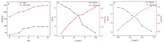 The effect of pH GO and GO-TOA (a) (C0(MB) = 50 mg/L); adsorption rate and capacity of GO (b) and GO-TOA (c) for different concentrations of MB (t = 120 min, pH = 10, dose = 0.2 g/L, T = 25 °C).