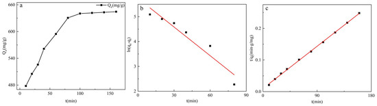 In the formula, qe belongs to the adsorption capacity at adsorption equilibrium, and qt represents the adsorption capacity at a certain time. K1 and K2 are the adsorption rate constants of adsorption kinetics, respectively [24,27].