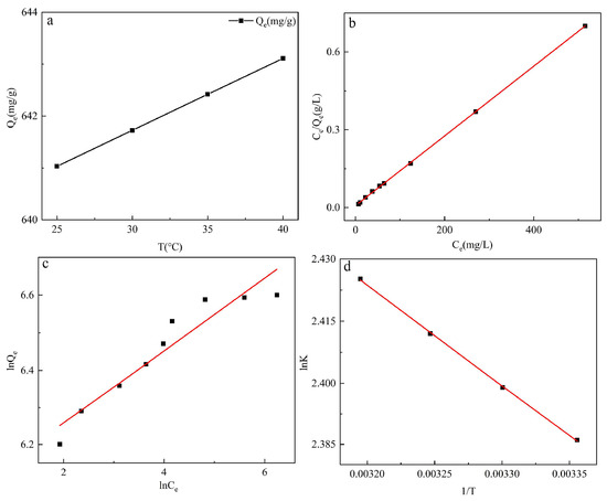 Figure 8 and Table 4 were obtained using a linear fit of the thermodynamic formula. As can be seen from Figure 8a, the adsorption capacity gradually increases with the temperature height, suggesting that the adsorption is an endothermic reaction. Since ΔH and ΔS are positive values, it indicates that the adsorption behavior is an endothermic physical adsorption process. In addition, a negative value of ΔG indicates that the adsorption behavior is spontaneous [33].