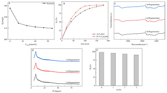 The regeneration performance of adsorbent is one of the key factors to evaluate an excellent adsorbent [24]. In this experiment, 10% hydrochloric acid solution and 95% ethanol were used to desorption MB from GO-TOA. However, we can see from Figure 9b and Table 5 that 95% ethanol is a good choice for MB desorption compared with 10% hydrochloric acid, because the desorption time of ethanol is shorter, and ethanol can be easily recovered by heating and evaporation. On the contrary, 10% hydrochloric acid will introduce chloride ions, which will lead to secondary pollution sources. Therefore, we choose 95% ethanol as desorption agent. It is apparent from Figure 9c,d that the structure of GO-TOA is substantially unchanged after three regeneration cycles, and the adsorption rate is still as high as 90.44% (Figure 9e and Table 5). These data fully demonstrate that GO-TOA is a promising MB adsorbent.