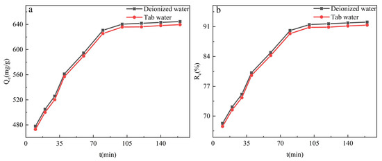 The adsorption capacity (a) and adsorption rate (b) of GO-TOA towards MB at a different time and water sample (pH = 10.0, dose = 0.2 g/L, T = 25 °C, C0(MB) = 140.0 mg/L).