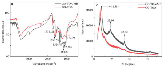 The N and O atoms in GO-TOA have high electronegativity and can adsorb MB by hydrogen bonding [24]. In addition, GO-TOA, which is rich in electronic amino groups, can produce electrostatic adsorption with cationic dye MB [43]. Not only that, but MB is rich in π electron aroma; these π electrons can interact with the π electron of GO-TOA [24]. Therefore, in this experiment, electrostatic adsorption, hydrogen bonding, and π-π interaction play an important role in adsorption. It can be seen from the infrared image of Figure 11a shows that the functional group structure of the material changes after MB adsorption, indicating that the MB was adsorption to the GO-TOA. The peaks at 2985 and 2759 cm−1 are obviously enhanced, which is the stretching vibration peak of C-H in methylene blue structure [24]. Two new vibration peaks are generated at 1714 and 879 cm−1, which belong to the tensile vibration peak of C=S and the in-plane bending vibration peak of C-H in the methylene blue structure. Two new peaks were also observed at 1122.386 and 1164.81 cm−1. Moreover, the peak of GO-TOA at 1650 cm−1 disappears after the adsorption of MB, which may be due to other functional groups shielding the absorption of this peak. In addition, two new vibration peaks are generated at 2985 and 2759 cm−1, which was the methylene vibration peak of the MB structure [24]. It can be seen from the XRD diagram of Figure 11b that the crystal structure of the material changes after the adsorption of MB. The peak of GO-TOA at 9.70° shifted to 10.34° and a new peak was generated at 22.96° and 42.82°, respectively, indicating that the crystal structure of GO-TOA has changed after adsorption of MB [44]. The above phenomena can fully prove that GO-TOA successfully adsorbs MB dye.
