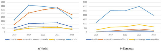 In Romania, interest over time in sustainable issues in general has been continuously increasing since 2018. An exploratory study in Romania from 2021 showed that a sustainable ecosystem had a potential to be developed with the engagement of different interested parties (entrepreneurs, innovators, universities, investors, government organizations etc.) [62]. A recent study proved that half of Romanians defined sustainability in relationship to environmental issues, pollution reducing efforts, health systems, and the protection of endangered species. Moreover, generational differences have been noticed, with the youngest one entering the labor market showing a more positive attitude towards a potentially sustainable world [63]. A Google search on key words considered relevant in the literature review for sustainability issues such as “durable”, “sustainable”, “eco-friendly”, “green energy” and “recycling” demonstrated a clear discrepancy of interest at a national level compared to the global level. The period considered in Google Trends to explore the word interest is July 2018 to June 2022 which covers the pre-pandemic, during mid-pandemic, and the post-pandemic contexts, is shown in Figure 1 [64].