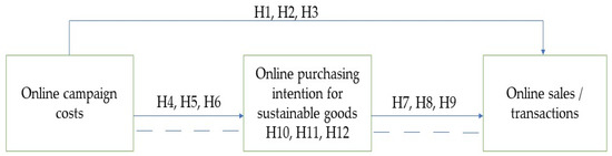 The next sections will describe the theoretical background of the concepts used in the paper, starting from recent approaches covering the pandemic period (Section 2), followed by the research methodology, including the hypothesis generated from the literature, the research structure model, and the statistical approach (Section 3). In the end, results will be particularized to clarify how online advertising costs relate to sales of sustainable products and customer purchasing intention and how online purchasing intention for sustainable goods relates to online sales in Romania (Section 4). Conclusions to the theoretical approach and the results achieved will be also outlined (Section 5).