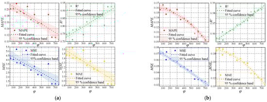 The variation of parameters will affect the prediction results and observing changes in evaluation indicators can determine the optimal parameters. The results of the parameter discussion are shown in Figure 7, where the parameters are taken at intervals and densely selected from the parameters that behave well. In Figure 7, the results of fitting the sample points using the function fitting method are shown and given the practical time-consuming issues. A simple polynomial function can be implemented to capture the trend in the variations of parameters.