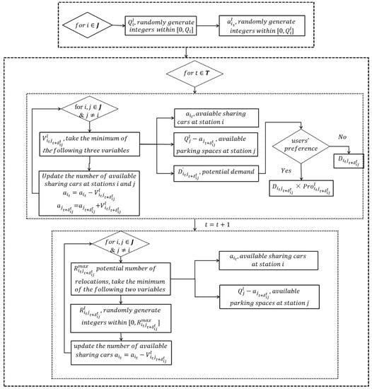 Equation (16) means that the number of available cars at station at time step , is equal to the number of available cars at that station at time step , plus the number of all cars arriving at station at time step (including the number of cars relocated to that station and the number of users driving leader’s cars), minus the number of cars departing from station at time step . represents that if sharing cars depart from time step at station , then the arrival time step is at station .