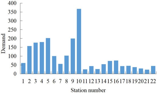The operational period (06:00 to 24:00) is divided into 18 time steps with one-hour duration. 06:00 to 07:00 corresponds to the 1st time step, and so on, and 23:00 to 24:00 is the 18th time step. The demand distribution of each station is shown in Figure 3, and it is clear that demand varies greatly from station to station.