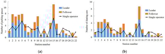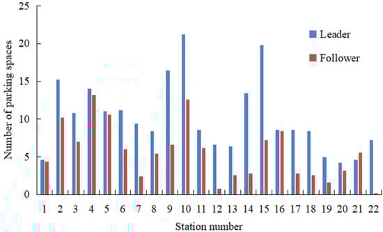 Figure 6 shows the allocation of parking spaces at each station in two-operator carsharing systems after considering users’ preferences. It shows that the leader allocates more parking spaces than the follower at most stations. The leader allocates more parking spaces to meet more demands. The total number of parking spaces that can be allocated to each station is limited, so the follower has fewer parking spaces to allocate.
