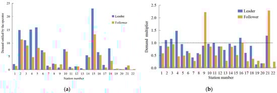 Demands met by the leader and the follower at each station; (a) Demand; (b) Demand multiplier.