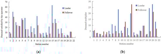 Figure 5a shows the demands satisfied by operators at each station. Combined with the distribution of parking spaces in Figure 4a, it is evident that allocations are closely related to demand satisfaction. The demand multiplier in Figure 5b is the ratio of demand satisfied by the leader or the follower to the demand satisfied by the single operator. The dashed line is the reference line corresponding to the demands that are satisfied by the single operator. When the demand multiplier is above the dashed line, which means that the demand satisfied by the leader or the follower is higher than that of the single operator, and vice versa. It can be seen that neither the leader nor the follower satisfies higher demand than the single operator at most stations. This phenomenon is consistent with the results in Table 5, where the average demand that can be satisfied by the single operator is 135.8, and 127.5 and 85.1 by the leader and the follower, respectively.
