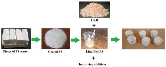 In this step, the PS waste was mainly dissolved by using gasoline (RON 92); different ratios of thus liquified PS have been combined as viscous liquid with a prepared paste of cement kiln dust hydrated by water.