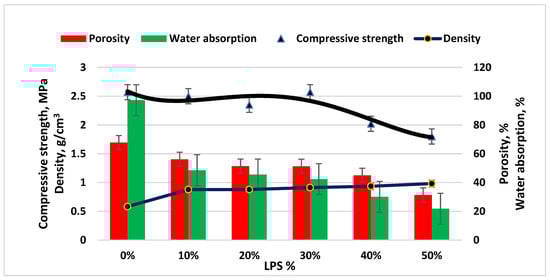 Compressive strength, porosity, density, and water absorption of the CKD-LPS composite.
