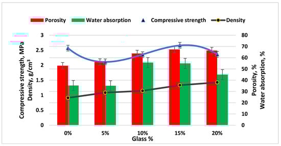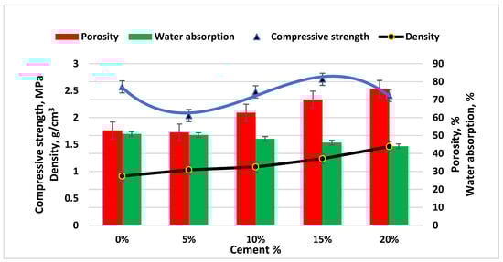 To reach the target of this study of improving the mechanical property of the composite material produced from two types of wastes, Portland cement was additionally added. Figure 5 shows various parameters of the cementitious samples with different ratios of Portland cement added to the original paste. As expected, density increases as the content of Portland cement increases. The composite of 20% volume Portland cement had a density of 1.46 g/cm3 compared to 0.9 g/cm3 without the addition of Portland cement. This means that cement has a significant influence on the density of samples. In this direction, the compressive strength was increased gradually by increasing the cement addition to reaching the maximum value of 2.71 MPa at an additive (Portland cement) ratio of 15%. In agreement with this behavior, Al-harthy et al. reported that concrete mixtures including cement with variable ratios of CKD (5–30%) have lower strength properties and absorption characteristics with decreasing the ratio of cement relative to CKD [55]. Portland cement was included to improve the mineral binding and to increase the ability to improve the hydraulic integrity of the cementitious product.