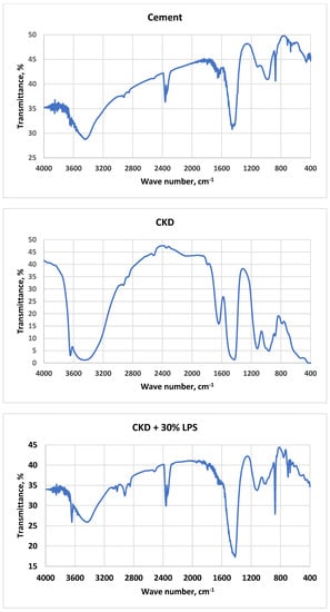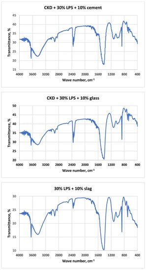 FTIR analysis was performed to investigate the functional groups of hydrated cement, hydrated CKD, CKD-30% LPS, CKD-30% LPS + 10% cement, CKD-30% LPS + 10% iron slag, and CKD-30% LPS +10% waste glass as shown in Figure 6.