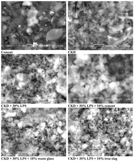 SEM of cement, CKD, and composites of CKD-LPS in the presence and absence of other additive materials.