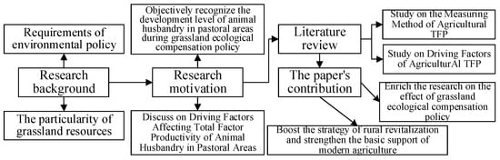 To sum up, there is little research on the combination of grassland ecological compensation policy and total factor productivity of animal husbandry in pastoral areas by scholars at present. The paper takes the relationship between the two as the starting point and discusses the implementation effect of grassland compensation policy from the perspective of total factor productivity of herdsmen’s animal husbandry. Based on this, from the perspective of the micro main body of herdsmen, the paper measures and compares the change and convergence of the total factor productivity of animal husbandry in various pastoral areas in Inner Mongolia, by using field survey data of pastoral areas in Inner Mongolia, and discusses its driving factors, with a view to providing some reference for coordinating the harmonious development of production, life, and ecology in pastoral areas and assisting the revitalization and modernization of pastoral areas. The overall structure of the introduction is shown in Figure 1.