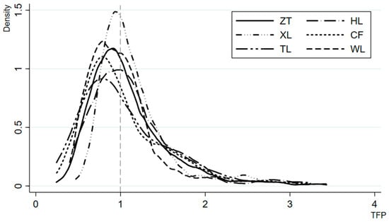 Using DEAP 2.1 software, this paper decomposes and measures the total factor productivity (TFP) of animal husbandry of the sample overall and regional herdsmen during the implementation of the grassland ecological conservation subsidy and award policy, with 2010 as the base period using short panel data for three years, 2010, 2015, and 2020, by the DEA–Malmquist index approach (see Table 4). On the whole, the total factor productivity (TFP) of herdsmen animal husbandry in Inner Mongolia region during the policy period was 1.062, with an average growth rate of 6.2%, and the overall TFP of the sample of 536 herdsmen was relatively concentrated, and the distribution of herdsmen with TFP > 1 was somewhat more dispersed compared to herdsmen with TFP < 1 (see Figure 2). The comprehensive technical efficiency was 1.689, which was the main driving force of total factor productivity growth of herdsmen’s animal husbandry in Inner Mongolia, while the technical progress was 0.628, with an average growth rate of −34.2%, showing a negative downward trend to the overall growth. Except for Ulanqab City, the average annual animal husbandry TFP of the sample herding households in each region during 2010–2020 is greater than 1, indicating that the level of animal husbandry production in each region has been improved to some extent, with Hulunbeier City and Xilin Gol League showing a greater overall increase and Chifeng City and Tongliao City showing a minor increase in animal husbandry TFP. From the results of the decomposition of Malmquist index, Hulunbeier City, Xilin Gol League, Chifeng City, and Tongliao City are similar to the overall situation of the sample, and the progress of comprehensive technical efficiency has positively contributed to the growth of total factor productivity in their animal husbandry industry, in which pure technical efficiency increased by 36.4%, 34.0%, 40.8%, and 36.7%, respectively, and scale efficiency increased by 4.0%, 7.6%, 48.5%, and 51.2%, respectively. Hulunbeier City and Xilin Gol League mainly rely on the pull of pure technical efficiency, while Chifeng City and Tongliao City mainly rely on the dual drive of pure technical efficiency and scale efficiency. Compared with the comprehensive technical efficiency, the technical progress of herdsmen’s animal husbandry production is less than 1, showing a negative growth, which indicate that herdsmen do not make enough efforts to improve and innovate the resource allocation and production-related technologies, hindering their total factor productivity improvement and progress in the process of animal husbandry production. In contrast, the average annual animal husbandry TFP growth rate during the policy period for the sample herdsmen in Ulanqab City was −4.6%, of which the comprehensive technical efficiency was 1.557, while the technical progress of other factors was 0.613, with an average growth rate of −38.7%, which was the main reason for the negative total factor productivity growth and production inefficiency of herdsmen’s animal husbandry. Figure 2 reports the kernel density of total factor productivity (TFP) in animal husbandry of the sample herdsmen in each league and City. It can be seen that the overall distribution of TFP of herdsmen in Xilin Gol League and Ulanqab City is relatively concentrated, while that of Hulunbeier City, Chifeng City, and Tongliao City are more discrete, and there are large disparities in TFP in animal husbandry among households, and the distribution of herdsmen with TFP > 1 is more dispersed than that of herdsmen with TFP < 1.