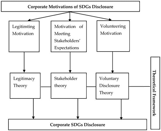 Although sustainability reporting is commonly used to describe the self-reporting of CSR-related activities [68], it is still optional in most countries [69]. Therefore, voluntary disclosure theory also offers another theoretical explanation for corporate SDG disclosures [70]. Initially, this theory was derived from game theory, meaning that a corporation’s motivation in making or withholding disclosures depends upon shareholders’ value [71]. In response to voluntary disclosure theory, Nishitani et al. [68] found a positive relationship between sustainability performance and its reporting. They claimed that companies are motivated to use sustainability-related reporting to aid improved decision-making by their shareholders. Furthermore, to address the stakeholders’ expectations, companies voluntarily engage in and account for sustainability-related issues in their reporting systems [72,73,74].