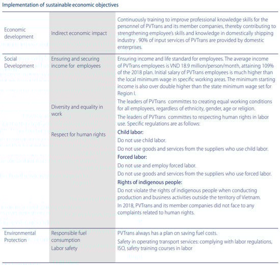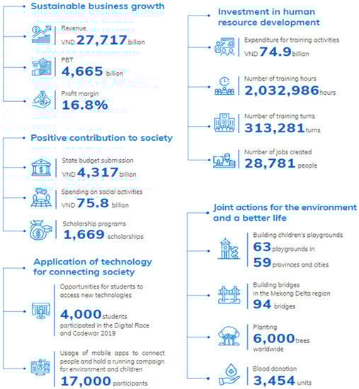 Vietnam joined the United Nations on 20 September 1977 to receive support for war reconstruction and humanitarian assistance [4]. In May 2017, Vietnam released its National Action Plan (NAP) to show the effort of the Government to implement the Vietnam SDGs (VN SDGs). It was promulgated as per Decision 633/QD-TTg dated 10 May 2017 of the Prime Minister, in which the global goals of Vietnam towards 2030 were set, including 115 specific targets, as presented in Table 2 [5]. For example, the following three extracts illustrate companies’ initiatives to achieve SDGs: