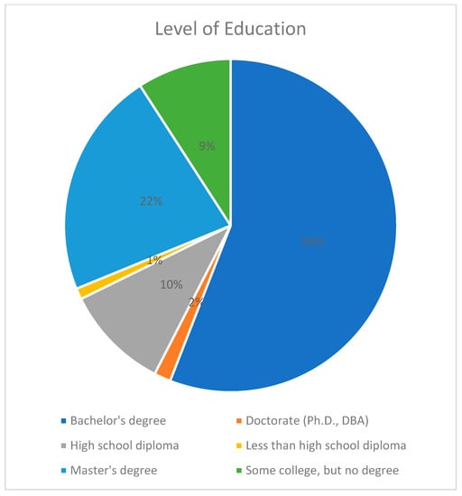 The level of education of the respondents was also considered through the survey to assess their awareness on solar energy accordingly. The general levels of education were as follows: 1% of the respondents had a degree lower than a high school diploma, 2% had a PhD or DBA, 9% had been to college but held no degree, 10% held a high school diploma, 22% held a master’s degree, and 56% held a bachelor’s degree, as shown below in Figure 6.