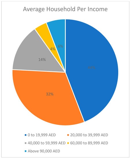 The financial status of the respondents was also included in the survey to demonstrate the financial ability of the interested respondents to buy and implant solar energy panels in their homes. The average household incomes per month of the respondents were comprised of 4% receiving a monthly salary of AED 60,000 to 89,999, 6% receiving a monthly salary above AED 90,000, 14% receiving a monthly salary of AED 40,000 to 59,999, 32% receiving AED 20,000 to 39,999 as a monthly salary, with 44% receiving a monthly salary of AED 0 to 19,999, representing the majority of the respondents, as shown in Figure 7.