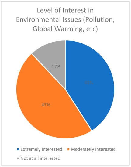 The survey also examined the general level of interest in the following subjects: environmental issues such as pollution, global warming, and overpopulation. The results show that only 4% of respondents were not at all interested, with 12% being not at all interested, 47% being moderately interested, and 41% of the respondents being extremely interested, as shown below in Figure 9.