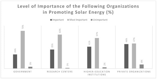 - The majority of the respondents claim that governmental organizations are important to promote solar energy, followed by research centers, higher education institutions, and lastly, private organizations.