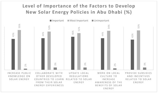The survey also questioned the respondents on the level of importance of the factors that can enhance the formulation of new solar energy policies in the city of Abu Dhabi. As per the majority of the respondents, one of the main factors in terms of importance is to increase public knowledge and awareness of solar energy, which will demand new policies to facilitate the expected and realistic scenarios to practically utilize solar energy. Likewise, the second major factor is to provide incentives for solar energy usage that will motivate the public accordingly, which will subsequently give birth to new policies that further regulate and develop the solar energy sector, while some respondents claim that establishing collaborations with developed countries to learn from their experience in solar energy is an important factor for developing new solar energy policies in Abu Dhabi. The results are demonstrated in Figure 13.