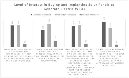 Notably, the respondent’s most favorable scenario is to buy and implant solar panels for personal use if the cost is supported by the government through green energy initiatives that focus on solar energy in the city. However, the second favorable scenario is for homeowners to buy and install solar panels at their own expense if it will help them lower their monthly electricity bills and, consequently, save money. The third most favored scenario is for homeowners to buy and install solar panels, at their own expense, and then sell the produced solar energy to the government utility grid and pay the balance of their electricity usage on a yearly basis without having the need to consume the generated solar energy nor save it in batteries. Lastly, the least favored scenario among the four scenarios is for homeowners to buy and install solar panels at their own expense if this practice will help save the environment as well as save natural resources that are at risk of depletion. The results are demonstrated in Figure 14.