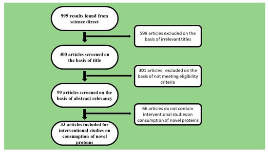 Five hundred ninety-nine studies were excluded because they were not related to the behavior of consumers consuming alternative/novel proteins. Three hundred and one articles were excluded due to being studies related to conventional meat consumption. Sixty-six articles were excluded since they did not contain interventional studies on consumption of novel proteins. After this process, 33 articles finally remained for systematic review. The algorithm search key for published articles was set for 2016–2022 using the MESH terms (“interventions”) AND (“Protein”) AND (“plant-based protein” OR “animal-based protein” OR “cultured meat” OR “edible insects” OR “single-cell protein” OR “pulses” OR “legumes”). The articles that met the criteria were [11,15,16,26,71,72,73,74,75,76,77,78,79,80,81,82,83,84,85,86,87,88,89,90,91,92,93,94,95,96,97,98,99,100], (Figure 1; Table 2).