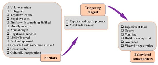 Regarding sensory profile, research showed that, for higher acceptance of novel products, health and environmental benefits were irrelevant compared to hedonic claims [107]. Many instruments have been utilized to operationalize mental construction to enhance the consumer acceptance of novel foods. These instruments employ statements set using a Likert scale confirming acceptance or rejection. An undisputed barrier to acceptance is food neophobia; therefore, the food neophobia scale (FNS) quantifies traits encouraging food neophobia. Similarly, the food technology neophobia scale (FTNS) has also been developed to address the fear of various new food technologies. The FTNS also effectively addresses the lower acceptance of novel foods [108]. Food-related disgust sensitivity, another mental disposition, can be validated through food neophobia. Different factors are responsible for initiating food disgust, with cultural and societal norms leading to deep-rooted disgust perception. Sensitivity to disgust is utilized to determine novel food acceptance or lack thereof, including novel animal-based food and novel food technologies. Positive experiences associated with novel foods enhanced parental support, and product visibility can lead to better and quicker adaptability. Some common elicitors and their behavioral consequences are grouped in Figure 2.
