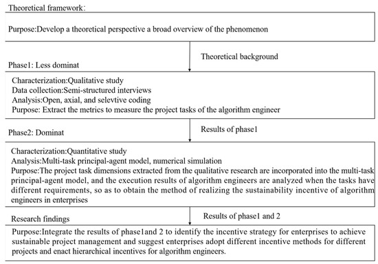 An outlook which would help to explain multi-task incentives to algorithm engineers, and help them to understand the field of multi-task principal-agent, is lacking. At this stage, either qualitative or quantitative methods would be insufficient to answer the research questions of this study. Thus, we used a mixed-methods design for development purposes, whereby we used findings from the qualitative phase to inform the research design of the quantitative phase. Figure 1 presents the mixed-methods design of this study. First, we conducted a qualitative study (Phase 1) to explore evaluation dimensions of task performance of algorithm engineers. The results were incorporated into the theoretical model. Next, we conducted a quantitative study (Phase 2) to empirically investigate the effects of incentive effect between different dimensions of the algorithm engineer task.