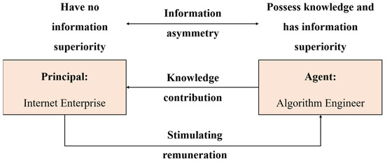 There is a principal–agent relationship between Internet enterprises and algorithm engineers based on algorithm projects. As the client, Internet enterprises encourage algorithm engineers to contribute their knowledge in the hope that algorithm engineering can complete tasks with high quality and efficiency. As the executor of the project, the algorithm engineer is the main body of the project implementation. A principal–agent relationship is established when an enterprise requires an algorithm engineer to complete a project task, as shown in Figure 2. In addition, there is information asymmetry between Internet companies and algorithm engineers. Algorithmic engineers have information advantages that Internet companies do not. Therefore, this paper draws on the model setting of the classical principal–agent theory in order to propose the conditions for the compatibility of participation constraints and incentives.