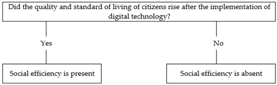 The social efficiency of digital technology implementation is a complex concept. Numerous studies on social efficiency do not provide an answer to the question “what is social efficiency?”. We refer to the definition of the social state from [33], where all material goods are distributed in such a way as to improve the quality and raise the standard of living of its citizens. Thus, in our case, social efficiency occurs if the quality and standard of living increases, which can be evaluated either quantitatively or qualitatively. In this study, the authors performed a qualitative assessment of social efficiency in a structured manner, as presented in Figure 2.
