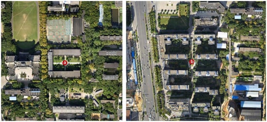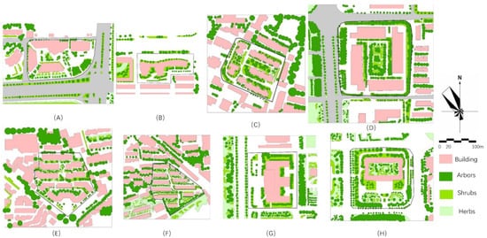 73]. The enclosed greening pattern designed around some buildings with large areas is also conducive to meeting the corresponding standards for the green plot ratio. According to our observation, many public buildings with large areas and their surrounding green spaces conform to the features of an enclosed greening pattern. In addition, this pattern is mainly found in commercial blocks, business blocks, and office blocks.
