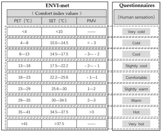 76]. By comparing the thermal comfort feelings obtained from the thermal comfort indexes (i.e., PET, SET, and PMV) in