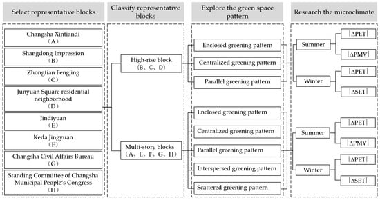 This paper aimed to study the microclimate of green space patterns in urban blocks at the microscale. Compared to those at the macroscale, studies at the microscale are more relevant to people’s lives. The urban block is, moreover, the most basic constituent cell of the urban organism, as the urban block is the basic unit for urban planning [