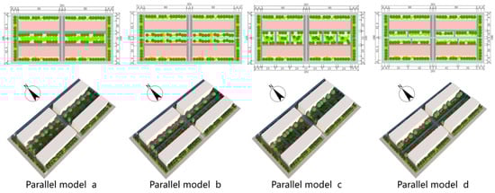 Figure 15 below shows that among the four parallel greening models, the differences of overall thermal comfort values in the areas were small in the models with different green space layouts as the unique variable. For instance, the minimum PET values in the four models were all 31.2 °C. However, the maximum PET values in the four models ranged from 36.6 to 36.8 °C, whose difference was less than 0.2 °C. For comprehensive consideration, the layout in summer model a was a superior layout, and the maximum values of thermal comfort indices PET and PMV in the area were the lowest compared with those of other models. The areas with good thermal comfort (blue, green, yellow and orange areas shown in PET and PMV diagrams) as a result of green space cold island effect between buildings in the area are wider. Compared with the other three models, the blue, green, yellow and orange areas in PET and PMV diagrams of model b are narrower. Nonetheless, the maximum values of PET and PMV in the area were lower than those of models c and d. Model b was a model which provide relatively worse thermal comfort. The maximum values of PET and PMV in models c and d were the same, which were the highest among the four models. From the perspective of PET, the area with a PET at 31–31.5 °C in model c was wider compared with model d. Compared with model c, there was a larger yellow or orange area with a PET at 32.5–33 °C in the middle of model d. From the perspective of PMV, model c presented a larger, relatively comfortable area with PMV less than 2.68 compared with model d. Thus, model c provided relatively good thermal comfort.