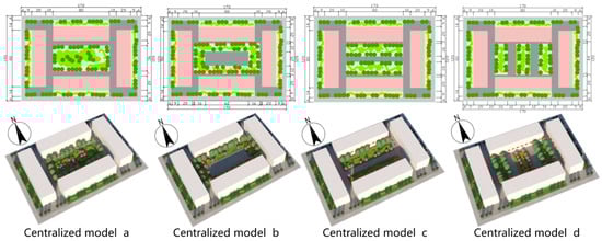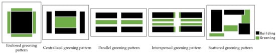 Figure 10 have green spaces only on two sides rather than four sides). Therefore, such a greening pattern and those with an enclosed greening pattern exhibit a very distinct feature. The interspersed greening pattern in