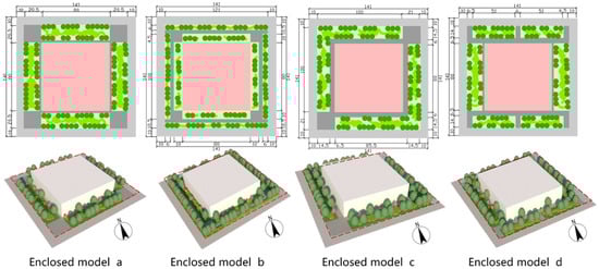 Figure 20 below shows the thermal comfort of each enclosed greening model in winter. After comparing the areas with a PET value greater than 4.8 °C in the figure, the area with a PET value greater than 4.8 °C (relatively good thermal comfort) in model a was the largest. The researchers regarded model a as a model that provided relatively good thermal comfort. In models b, c, and d, the areas with a PET greater than 4.8 °C presented little difference. Compared with models c and d, the main feature of model b was in that there was a larger area with a PET value greater than 6.4 on the south side of the building. There was an area with relatively better thermal comfort (PET between 4 and 5.6) next to the east side of the building. There was an area with a PET greater than 6.4 on the south side of each of models c and d and two areas with a PET between 4.8 and 5.6 on the east and west sides of and with a certain distance from the building. The maximum PET value in model a was as high as 8.07 °C. This was much higher than the maximum PET values (7.14 and 7.1 °C) in models c and d. The maximum PET value in model b was 7.98 °C, which was slightly lower than that in model a. The simulated SET values of the four different models at 16:00 on 15 December 2020 indicate that the yellow, red, and purple areas with better thermal comfort in model a were larger. The thermal comfort of model a was better than those of models b, c, and d. In model d, the area around the building with an SET greater than 9 °C was larger than those in models b and c. The researchers believe that this may be considered a superior choice for thermal comfort. However, model d was worse than model a under the consideration of thermal comfort for the whole area. In the south of the building in model b, there was a larger area with an SET greater than 9 °C. Although the area with an SET greater than 9 °C at the south of the building for model c was smaller than that for model b, there was a larger area with an SET greater than 9 °C on the right side of model c, except for model b. The maximum SET value in model a was 11.89 °C, which was much higher than those in the other three models. This value in model b was 11.72 °C, which was lower than that in model a. The maximum SET values in models c and d were 11.05 and 11 °C, respectively, which were significantly lower than those in models a and b. There were relatively small differences in the areas of the zones with relatively good thermal comfort (SET greater than 9 °C) in models b, c, and d. The distribution locations of zones with relatively good thermal comfort in the three models were obviously different.