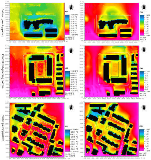 Figure 11, the thermal comfort of the entire area in the layout of the green space parallel type had a more uniform value, and the gap between the maximum and minimum values was small. In the green space concentration type, although the green space was enclosed by buildings and the thermal comfort of the central green space was not as good as that of the open area outside the enclosed area of the high-rise buildings; however, the large-scale green space in the center undoubtedly had a cold island effect. The absolute values of the difference between the average PET and PMV of the green area and the optimal values considered by scholars for this case are 8.39 and 1.33, which were not as good as the values of the parallel greening type, but slightly better than the ones in the enclosed greening type. In the green space enclosed blocks (enclosed greening pattern), the green space was in the shape of a belt around the building, with the characteristic of a narrow width of the whole circular green belt. Under this layout of green space, there were only areas with the best thermal comfort values immediately around the buildings. With the increasing distance of the green space from the building, the thermal comfort of it gradually became poorer [