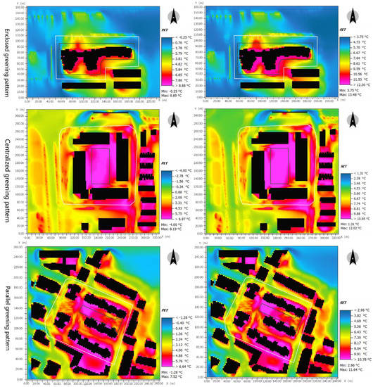 Table 6 below, the best thermal comfort was found in the areas with green coverage in the centralized greening type (|ΔPET| = 11.26, |ΔSET| = 10.88). It is believed by the researchers that in the area enclosed by high-rise buildings, more cold air blowing around was blocked by the buildings. A green space acts as a good warming effect in winter in this area. In the enclosed greening type, the green space was enclosed around the building in the form of a belt. As shown in