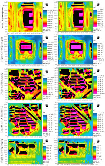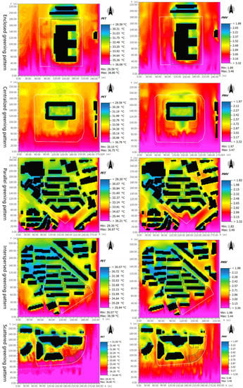 Figure 13 shows the thermal comfort in summer for blocks with five different green space patterns of multistory blocks. Similar to