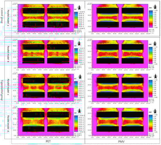 2, and a greening structure with a combination of arbors, shrubs, and herbs in a proportion of about 2:2:1. The simulation results of PET and PMV at 14:00 in summer are shown in