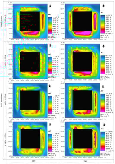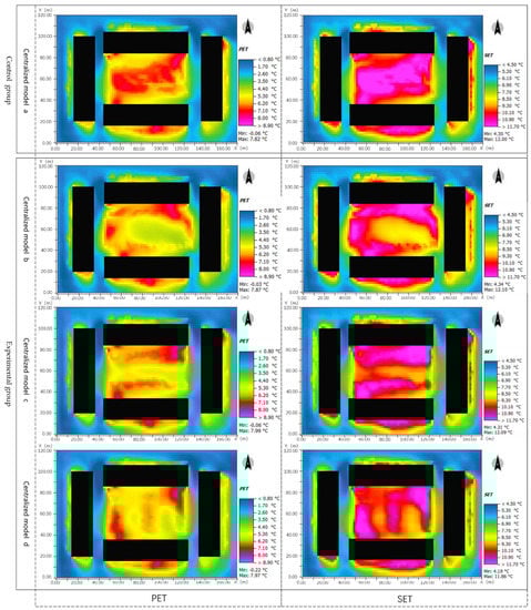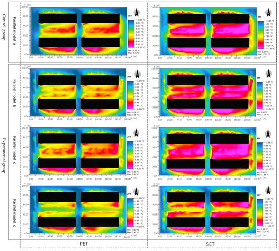 Figure 16 displays the thermal comfort simulation results of the four parallel greening models in winter. From the perspective of PET, models a and c provided good thermal comfort effect, where the yellow, orange, and red areas were wide. Moreover, a larger red area with a PET of approximately 6.6 °C appeared in the middle. In models a and c, the maximum PET values both ranked second (7.91 °C). The maximum PET value in model b was 7.96 °C, ranking first among the four models. Nevertheless, although there were large yellow and orange areas with good thermal comfort in model b, the red area with a PET at approximately 6.6 °C in model b was obviously smaller than those in models a and c. In model d, the maximum PET value (7.42 °C) was obviously lower than those of other three models, and the red area with a PET at approximately 6.6 °C was the smallest. From the perspective of SET, the maximum SET value in model c was 11.98 °C. Among the maximum values of the four models, it was second only to model a (12.12 °C). In model c, the superior area with SET was greater than 8.6 °C is the largest, which was obviously larger than those of other models. In model a, the maximum SET value (12.12 °C) was the largest among the four models, and there was also a large superior area with an SET greater than 8.6 °C, which was obviously smaller than that of model c yet. In model b, the superior area with a maximum SET value ranking third (11.70 °C) and which was greater than 8.6 °C was also obviously smaller than those in models a and c. The maximum SET value in model d ranked fourth among the four models (11.24 °C). In model d, the superior area with good thermal comfort and an SET greater than 8.6 °C was the smallest.