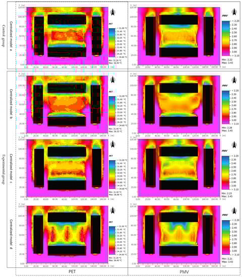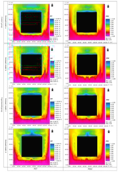 Figure 17. It was discovered that the maximum values for the PET and PMV in model d among different the green space concentration models were the lowest, and there was a large area with relatively good thermal comfort (PET less than 33.4 °C and a PMV less than 2.7). In model a, the maximum PET value was slightly higher than that in model d, and the maximum PMV value was the same as that in model d. In model a, there was also a large area with relatively good thermal comfort (PET less than 33.4 °C and PMV less than 2.7). In model c, the maximum PET value was higher than those of other models, and the maximum PMV value was higher than those of models a and d and equal to that of model b. In the model, the area with relatively good thermal comfort (PET less than 33.4 °C and PMV less than 2.7) was smaller than those of model a and b, but larger than that of model b. In model b, the maximum PET and PMV values were the largest among the four models, and the area with superior thermal comfort and PET less than 33.4 °C and PMV less than 2.7 was the smallest.