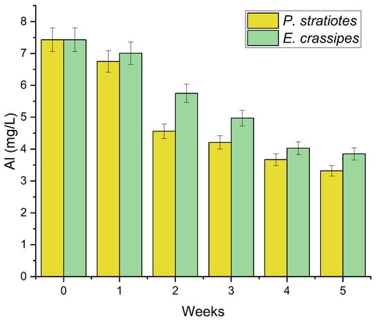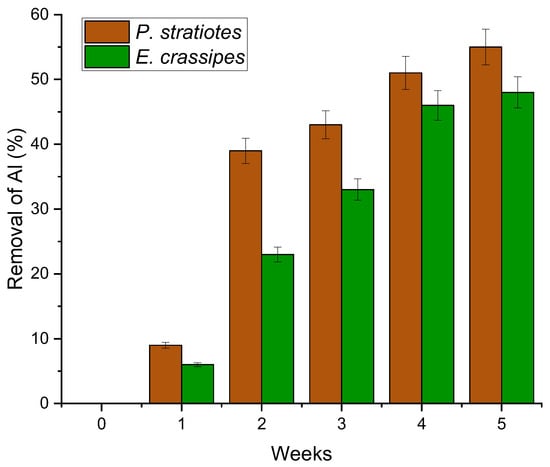 The removal percentage for each pollutant parameter is shown in Figure 2, indicating that contact time also had an impact on removal percentage. The best removal percentage of Fe was reached after five weeks for E. crassipes (>65%). The sorption of Mn plant roots showed the same result. After five weeks of contact, the best removal percentage of Mn was reached. In terms of Mn removal, P. stratiotes showed better removal ability compared with Fe. An opposite result was observed for Al, Ca, and Mg, for which P. stratiotes had higher percentage removal than E. crassipes. These results also confirmed that E. crassipes has better potential for heavy metal removal, while P. stratiotes is better for the removal of lightweight metals.