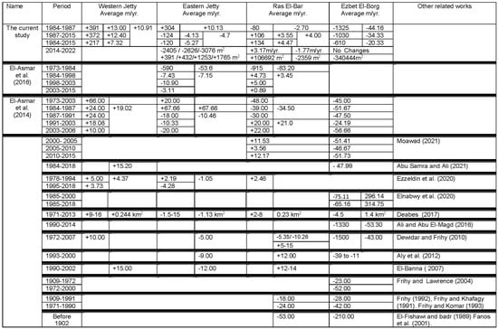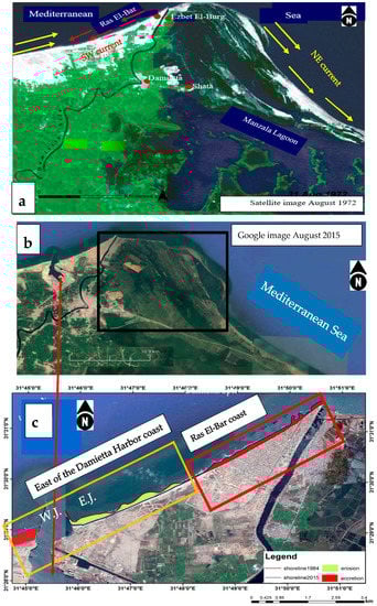 - El-Banna, M. Erosion and Accretion Rates and their Associated Sediment Characters along Ras El Bar Coast, Northeast Nile Delta, Egypt. Environ. Geol. 2007, 52, 41–49. [Google Scholar] [CrossRef]